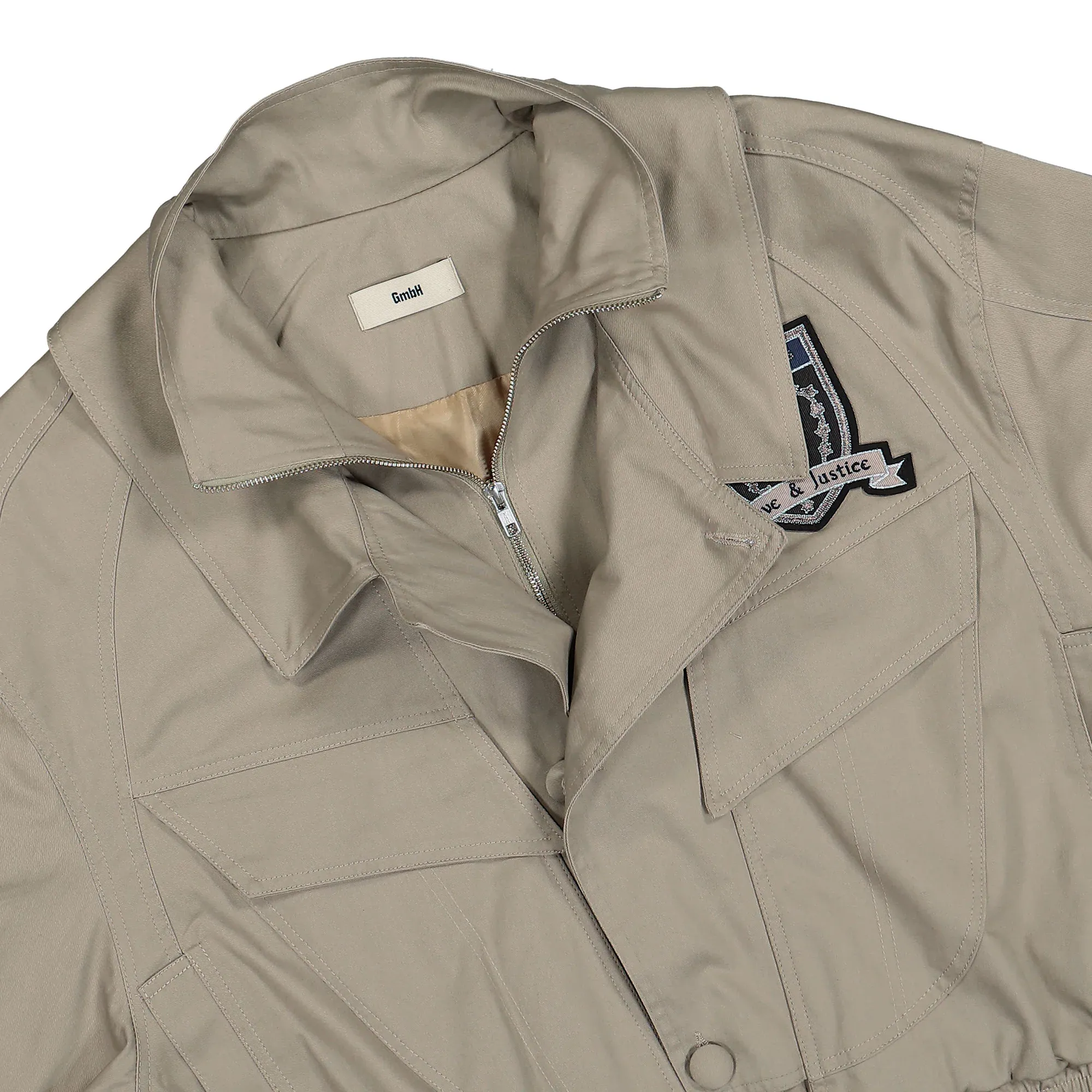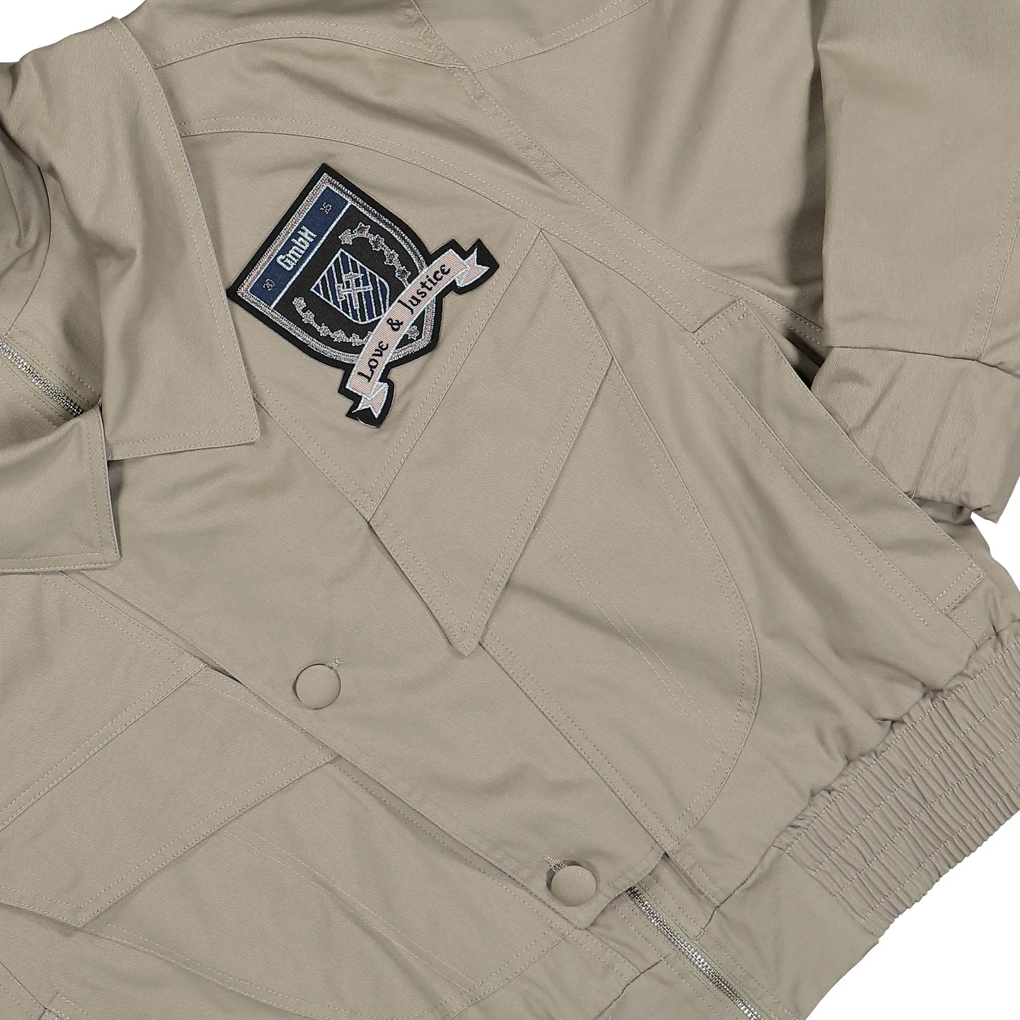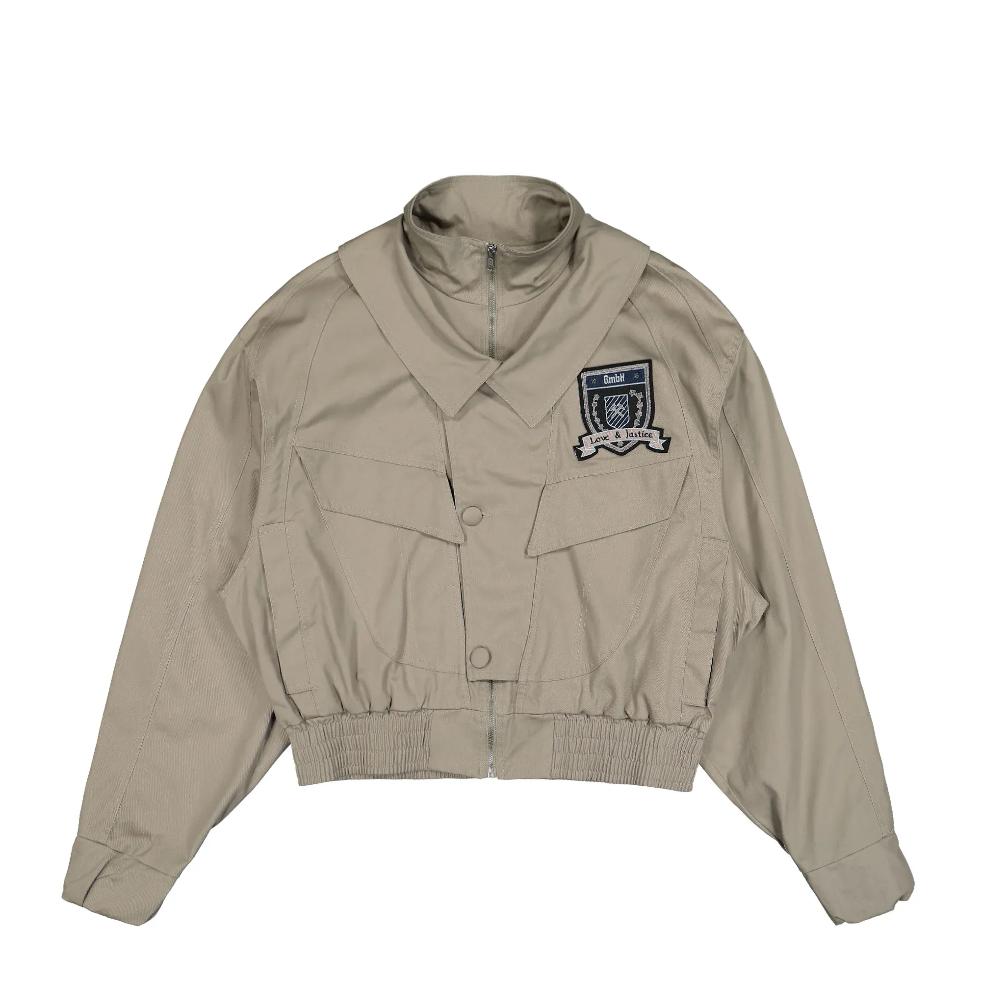 Crafted from 100% cotton, our Double Collar Harrington Jacket showcases a Love & Justice crest patch on the chest. With 4 pockets, a zipper and extra button placket, and an elastic waistband for a perfect fit, this beige jacket combines style and functionality for any occasion.